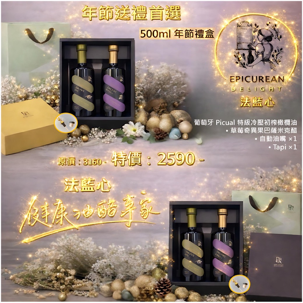 新春送禮,首選【法藍心】。嚴選新鮮橄欖油與香醇巴薩米克醋,層次豐富、風味細膩,為團圓餐桌增添幸福滋味。